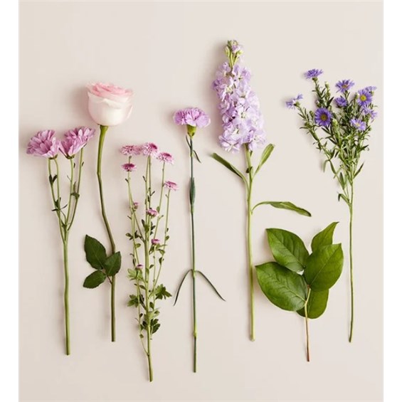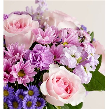 EXCLUSIVE Just like a daydream. Our delightful lavender bouquet is gathered with accents of pink and lush greenery in an embossed lavender vase that complements the delicate beauty of the blooms.