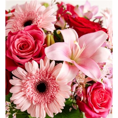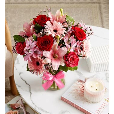 Inspired by the rich beauty of the European countryside, our romantic bouquet reveals all the feelings you have in your heart. Fresh-picked pink & red blooms are on display inside a glass vase finished with ribbon, creating a timeless gift for someone you love.